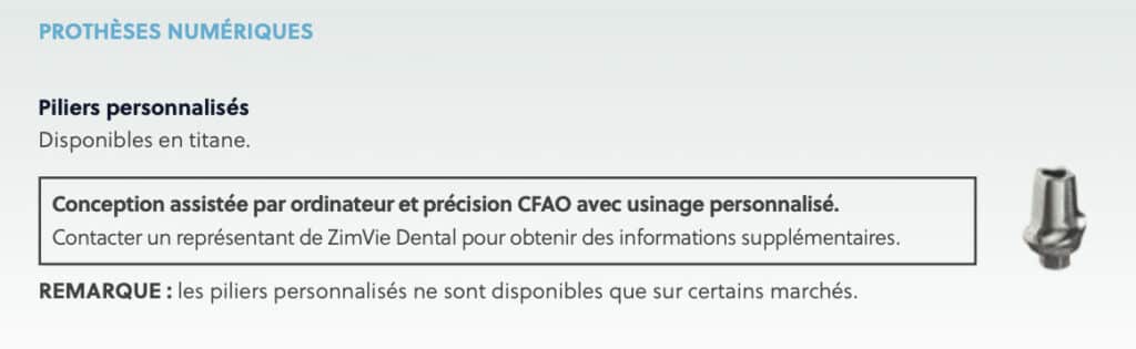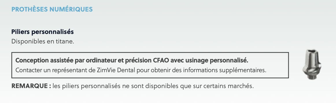 La société ZimVie nous rend attentifs au fait que la mise en place de ce type de pilier fait perdre la garantie du travail prothétique par son centre d’usinage ZfX de même que la garantie sur l’implant.