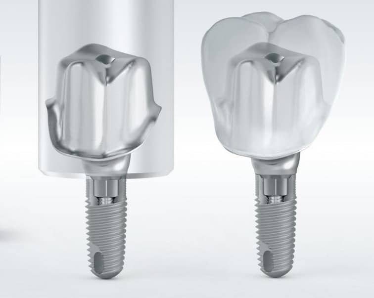 Une seule option prothétique possible pour ces piliers qui n’est pas recommandé pour une option « pilier vissé et dispositif scellé » : ces piliers sont conçus pour une restauration transvissée.