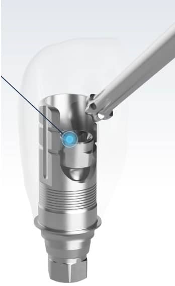 Son départ fin et rectiligne permet de le placer sans risque d’interférence osseuse sur un implant en position infra-crestale (dans la mesure où le choix de la hauteur du départ a été fait judicieusement selon l’enfoncement osseux !) :