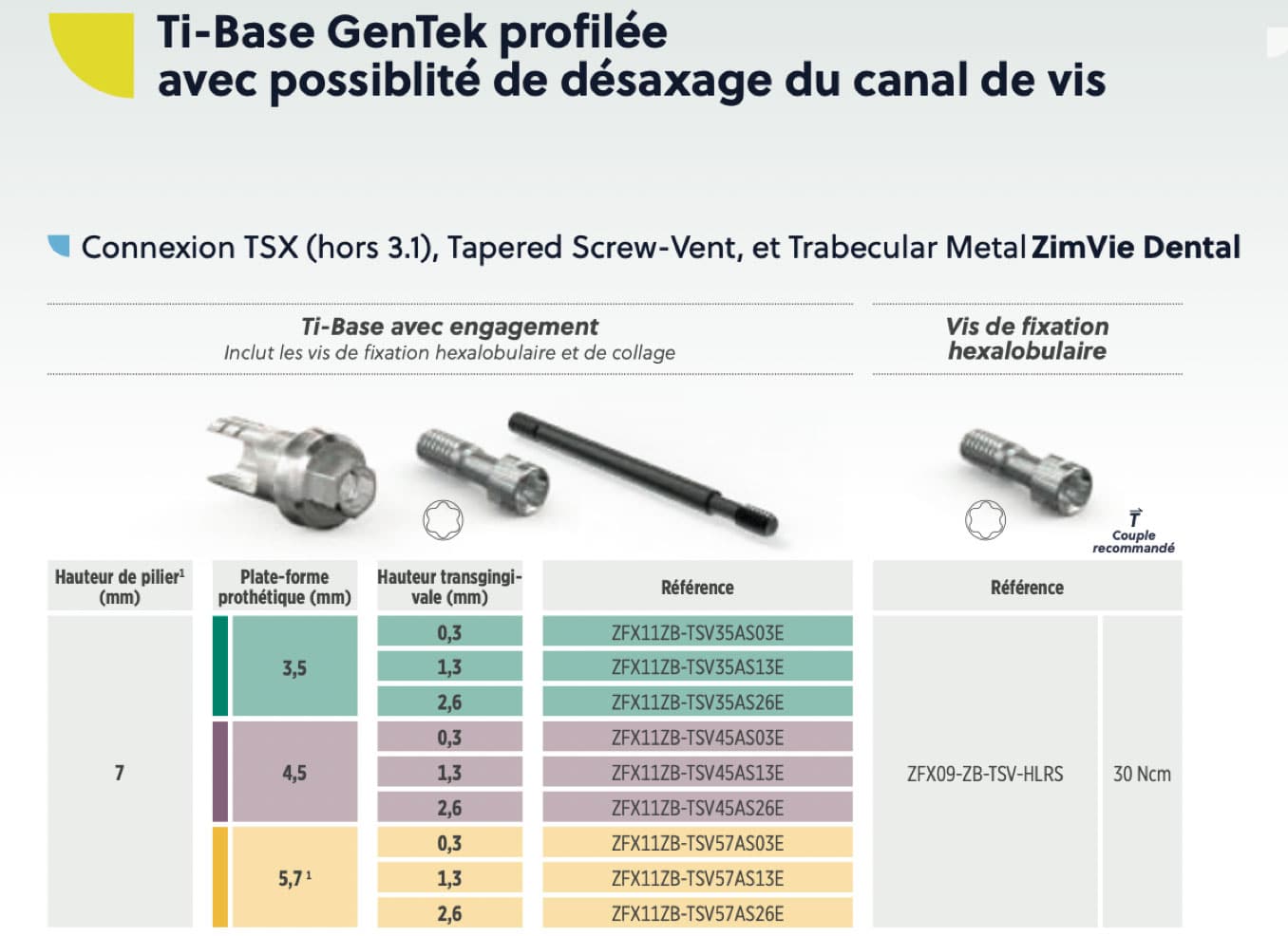 Nous attendons que la société ZimVie nous propose en plus des piliers Ti-Base Gentek droits déjà existants un pilier Ti-Base supplémentaire :