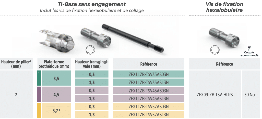 Ce pilier Ti-base se fixe avec la vis qui lui est dédiée : réf ZFX09-ZB-TSV-RS ; il est déconseillé d’essayer de le fixer avec une vis MHLAS.