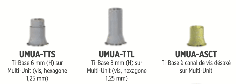 – ces piliers UMUA peuvent être coiffés par des Ti-base droits de 6 ou 8 mm de hauteur (réf UMUA-TTS ou UMUA-TTL) ou par des Ti-base à canal de vis désaxé (réf UMUA-ASCT) : ces Ti-base sont choisis en première intention pour les piliers UMUA