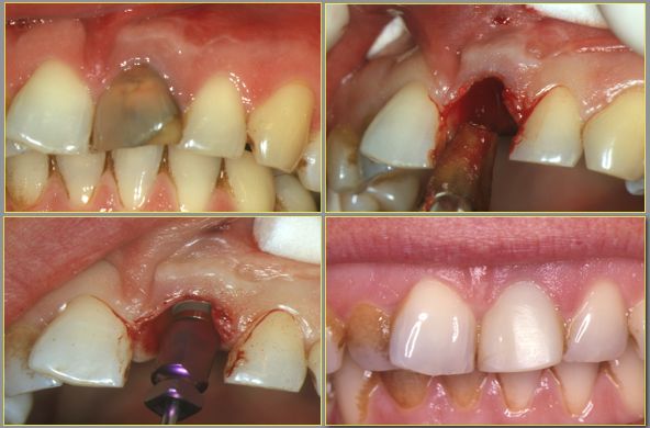 Une nouvelle option consiste à mettre en place immédiatement après la pose de l’implant une couronne provisoire pour éviter le port d’une prothèse amovible inconfortable et permettre par ailleurs de conserver le volume initial des tissus (os et gencive). Les conditions anatomiques doivent être idéales avec en particulier un ancrage osseux solide de l’implant. La technique peut même être poussée jusqu’à pratiquer dans le même temps opératoire l’extraction de la dent, la mise en place de l’implant et de la couronne provisoire :