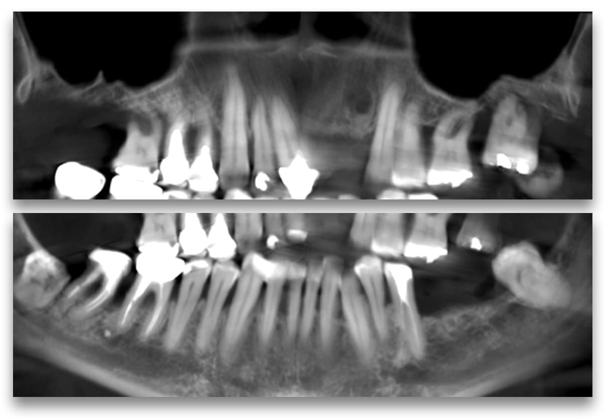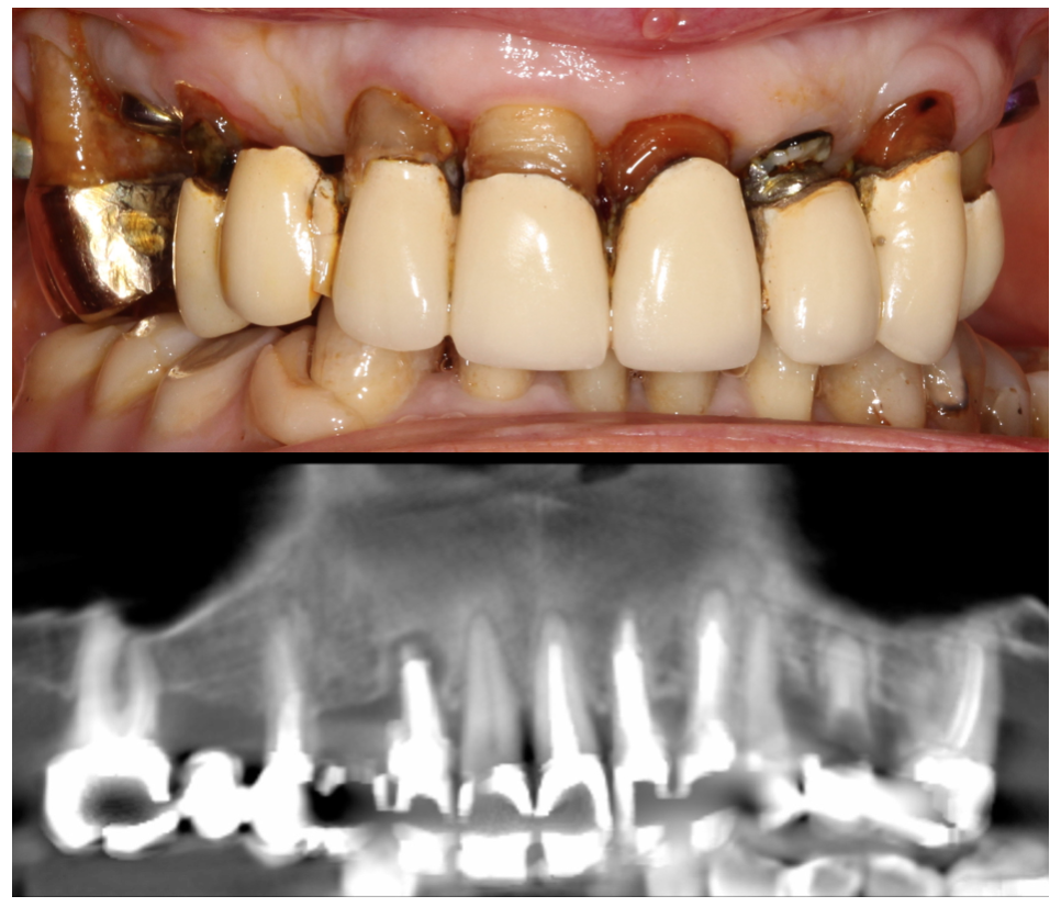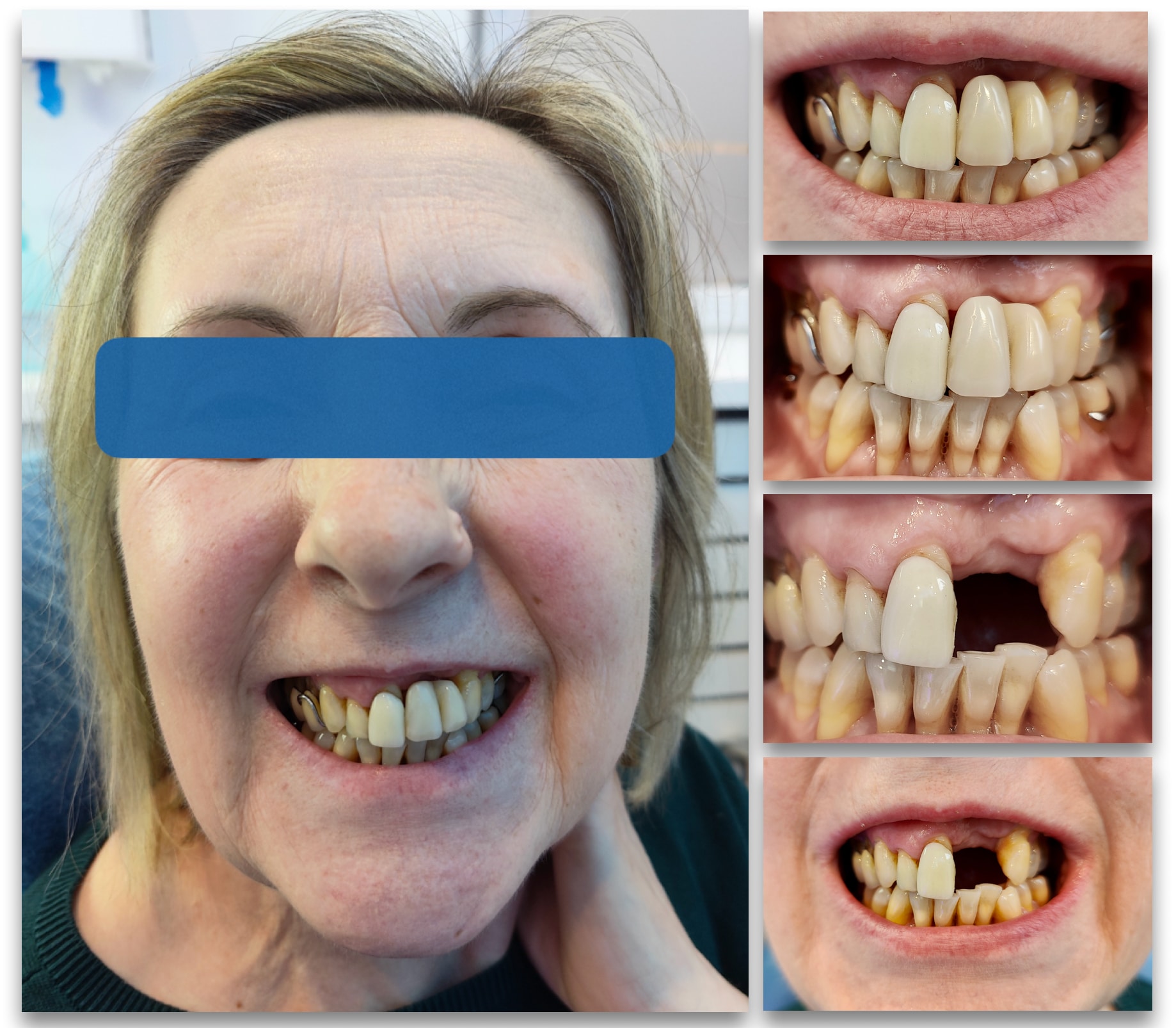 Un examen clinique approfondi et une étude cône beam montrent une situation dégradée sur beaucoup de dents et une restauration complète est envisagée au maxillaire.