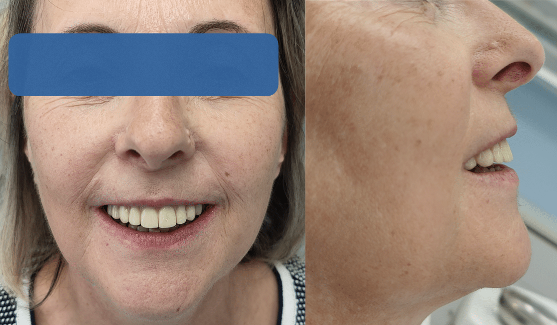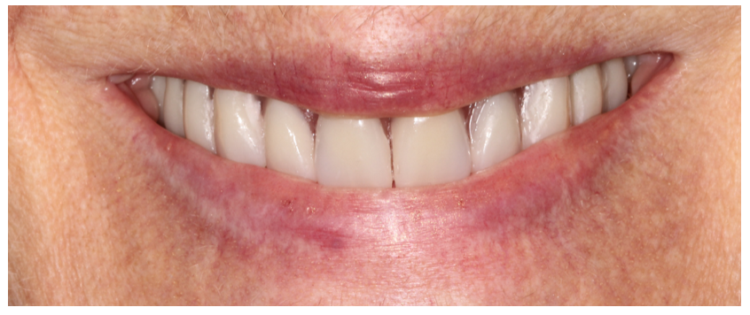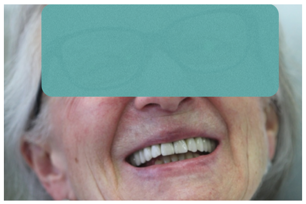 Par ailleurs, le découvrement de la lèvre créant un sourire très inesthétique, la restauration implanto-prothétique devra tenir compte de cet aspect très important pour la patiente.