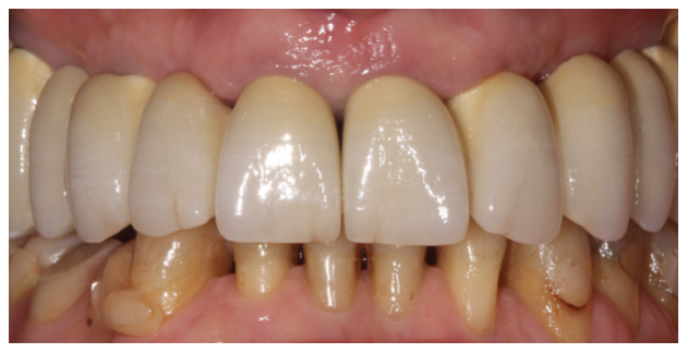 Le point déterminant de la réussite esthétique de cette restauration a tenu au fait qu’au moment de la chirurgie initiale, la ligne de transition implanto-prothétique a été relevée au-delà de la ligne du sourire.