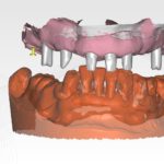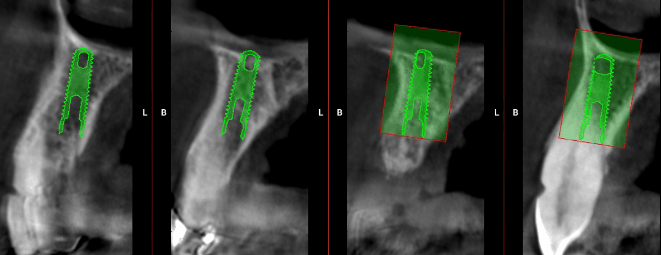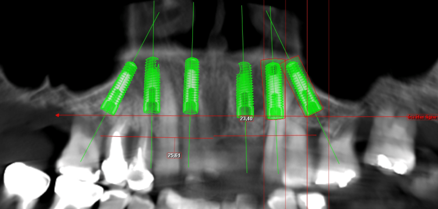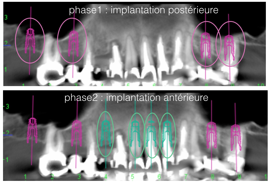Notez que l’axe des implants distaux a permis d’éviter les sinus pour une simplification du protocole chirurgical