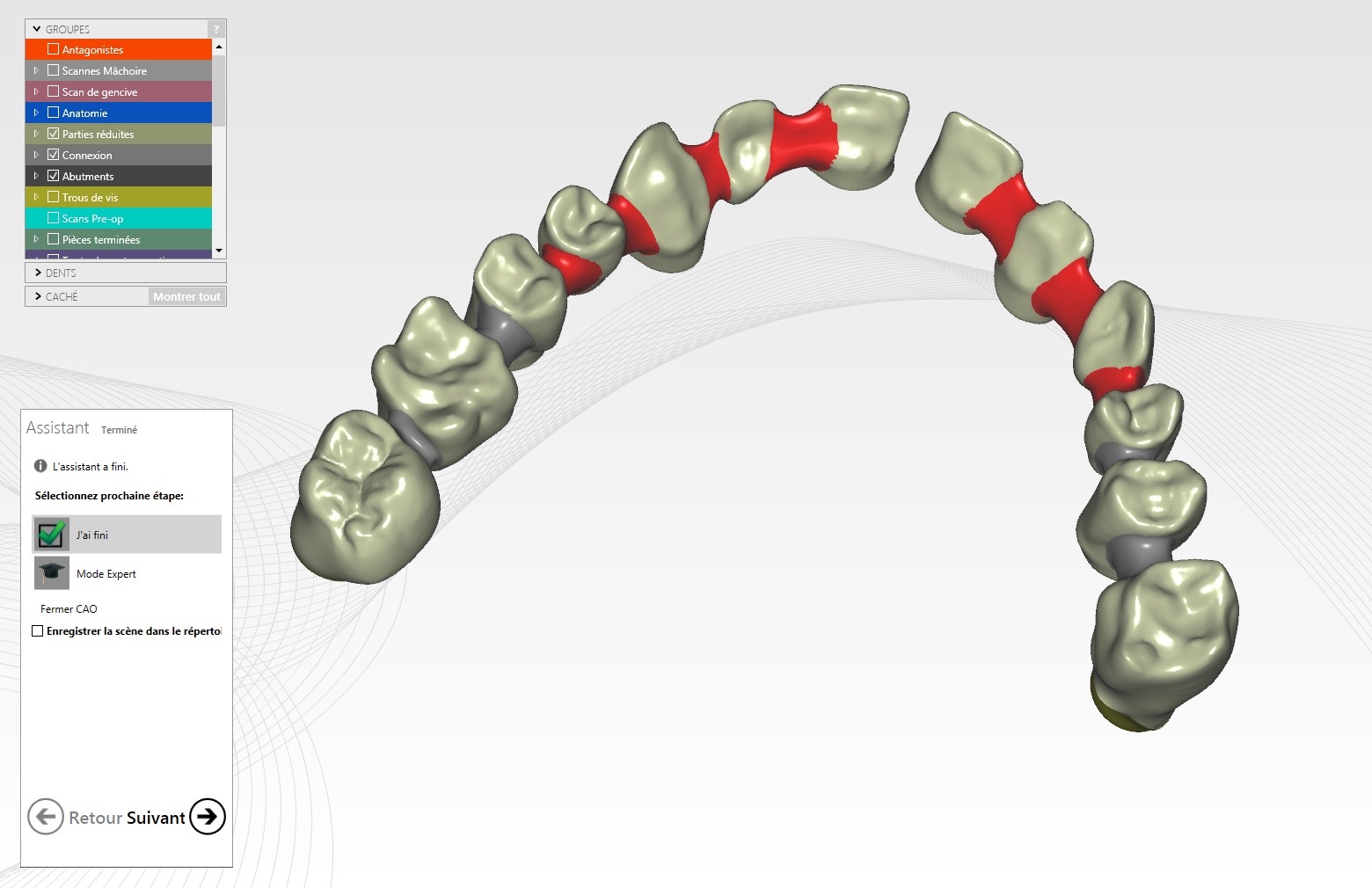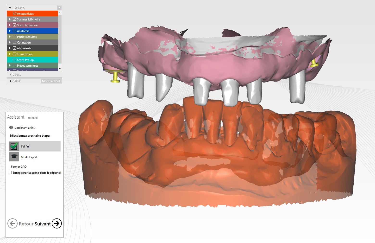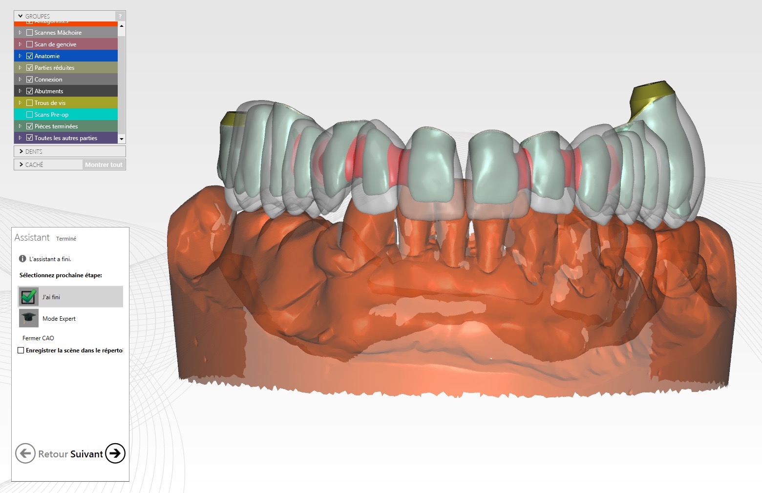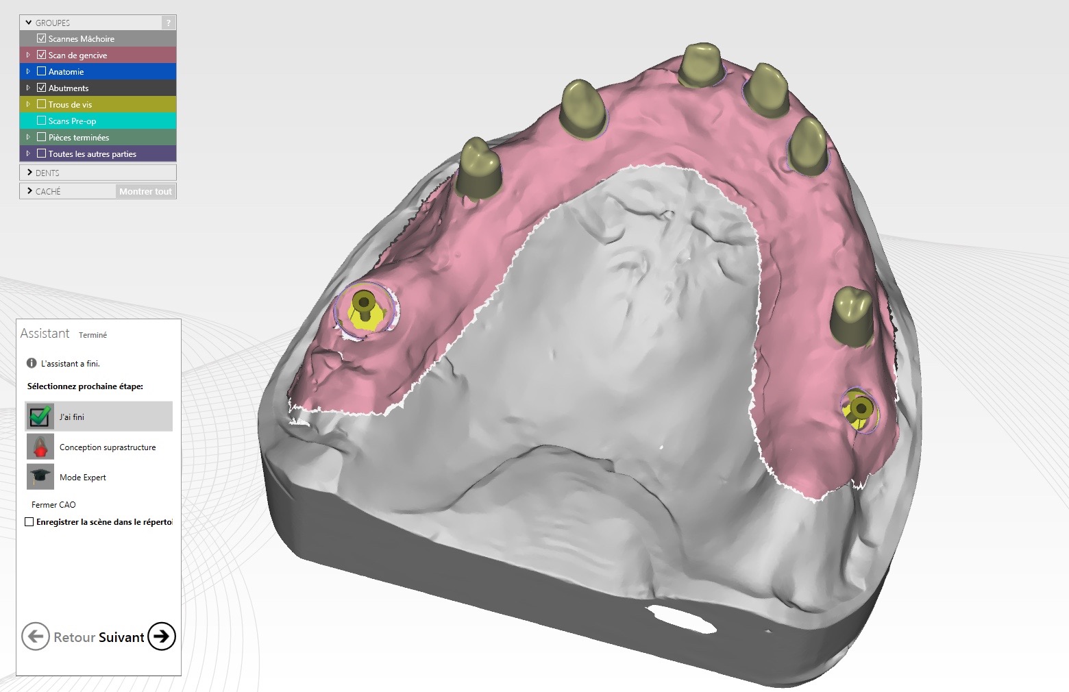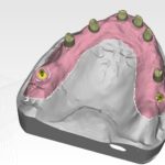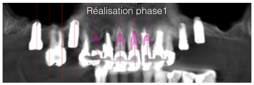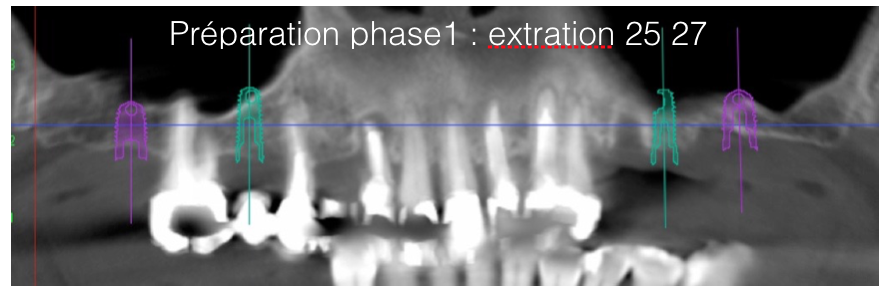 Le projet chirurgical permet d’envisager d’extraire l’ensemble des dents maxillaires et de placer six implants entre 15 et 25 pour la réalisation d’un bridge transvissé de 12 éléments :