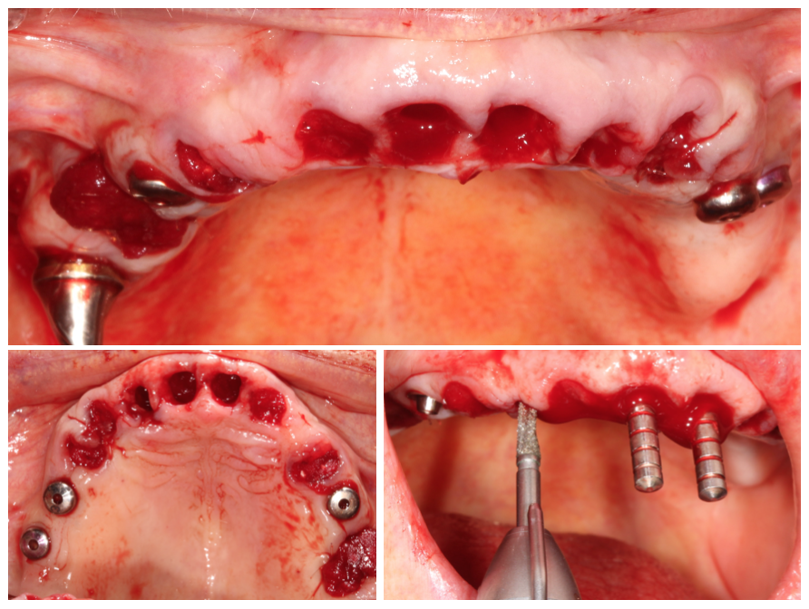 La pose des implants devra (et pourra) être précédée d’une résection osseuse verticale suffisante après les extractions afin de remonter la ligne de transition implanto-prothétique à la limite du découvrement de la lèvre pour assurer un sourire plus esthétique. C’est ce dernier point qui décide la patiente à accepter ce plan de traitement de restauration globale.