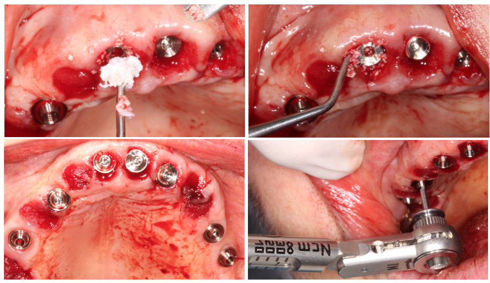 Dans ce cas, la pose des implants a été réalisée sans guide chirurgical : ce sont les alvéoles déshabitées qui ont guidé les forages.