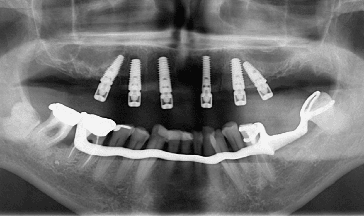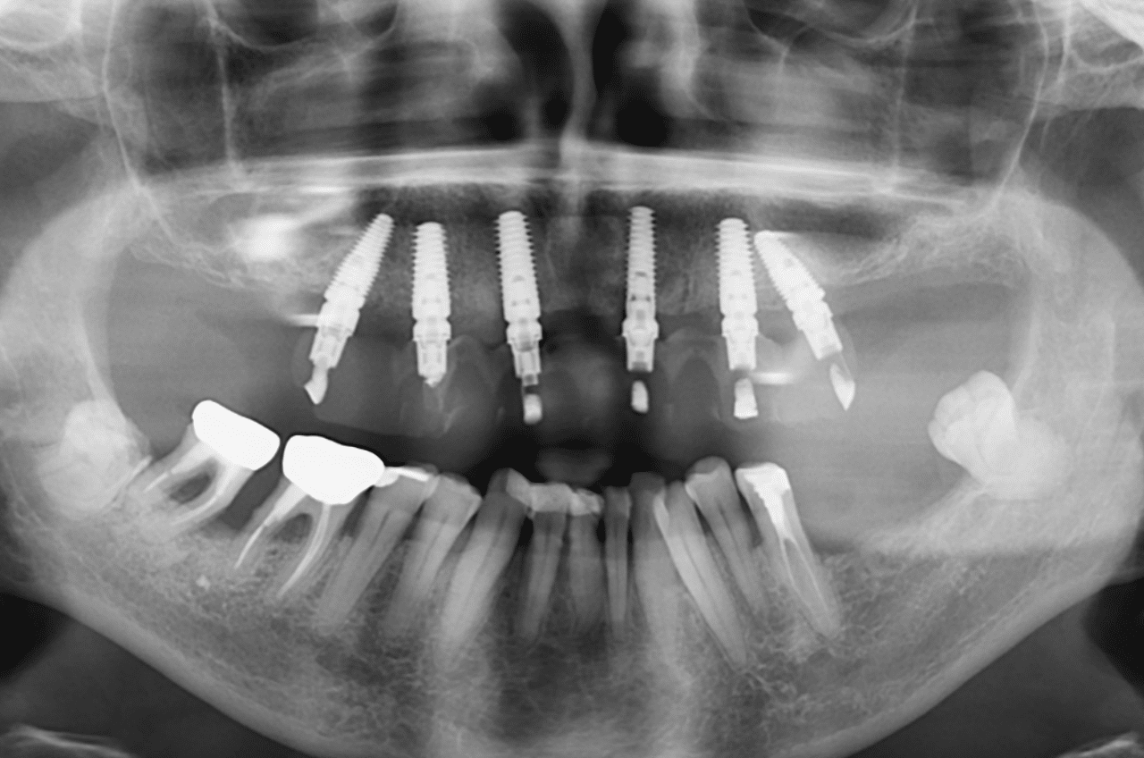 Radio de contrôle post-opératoire (les alvéoles ont été comblées par os autogène et BioOs) :