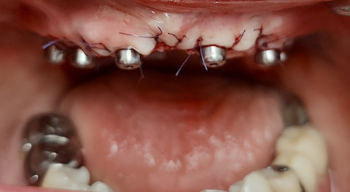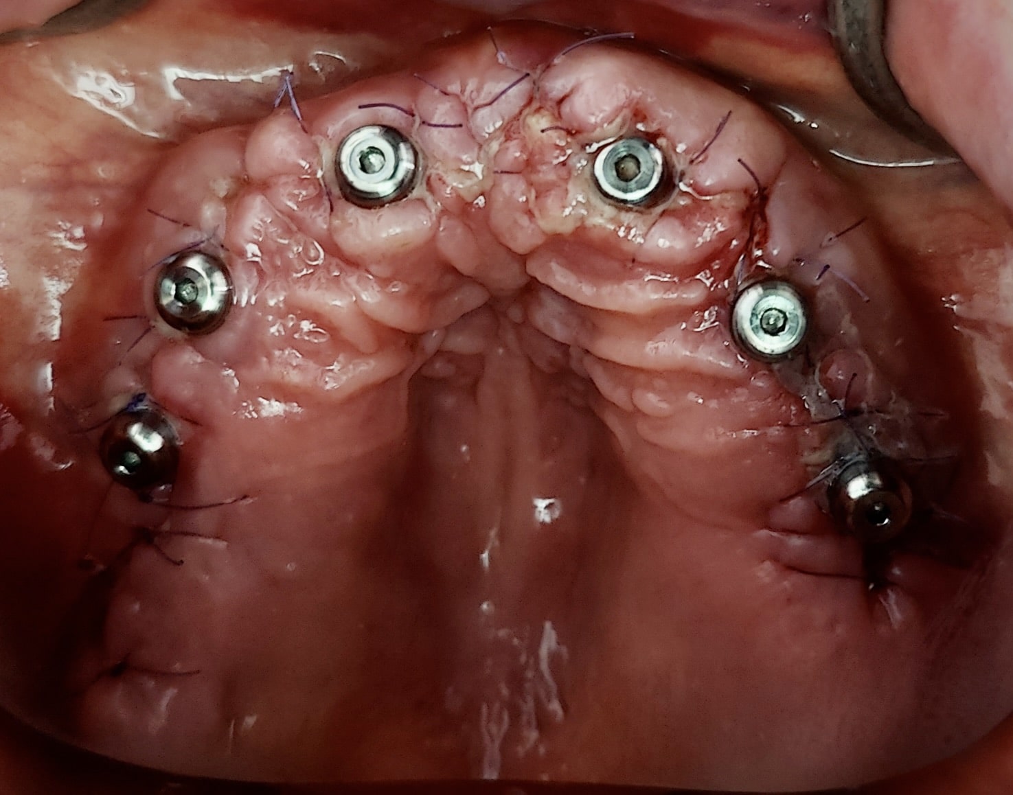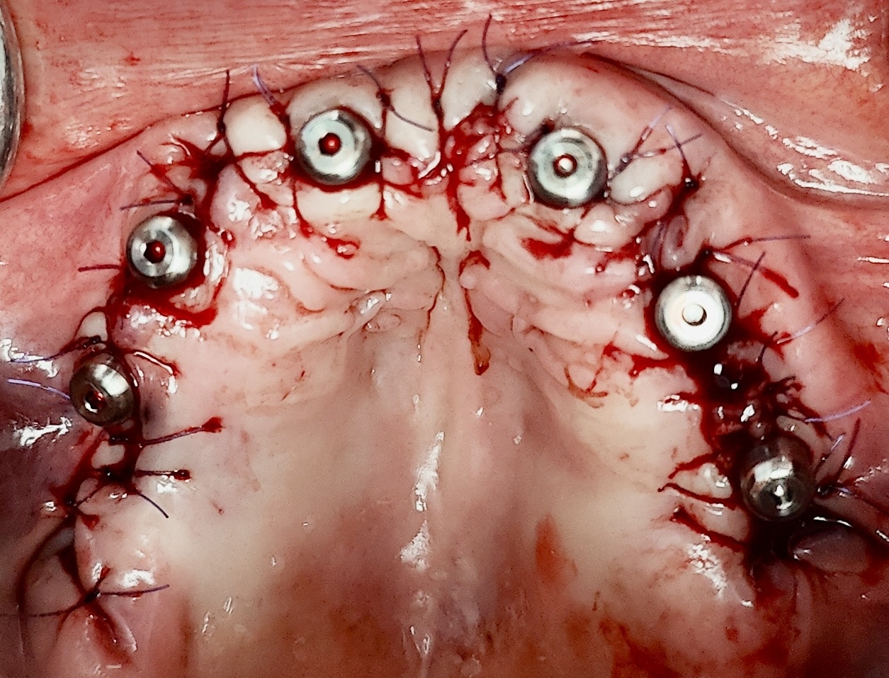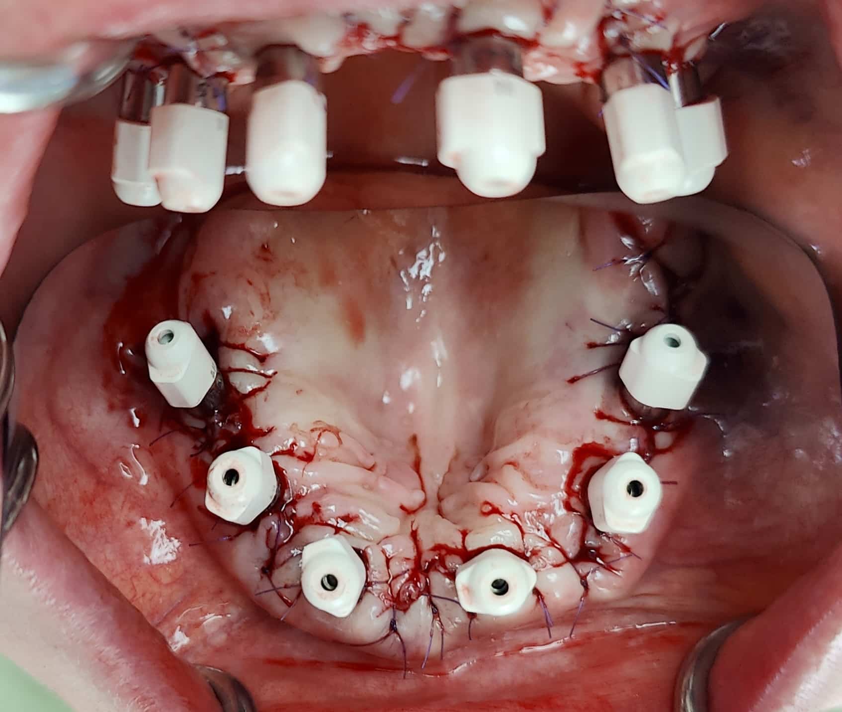 Vue clinique en fin de chirurgie des implants recouverts de piliers coniques :